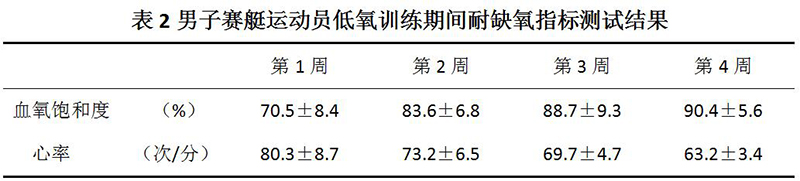 觀察平均血氧飽和度和心率,我們發(fā)現(xiàn):低氧組運動員機體在承受2000m低氧濃度的負荷刺激時,血氧飽和度值逐漸升高。心率逐漸變緩。大負荷訓練期間,經(jīng)過4周的低氧訓練,運動員對缺氧的耐受能力逐漸提高。