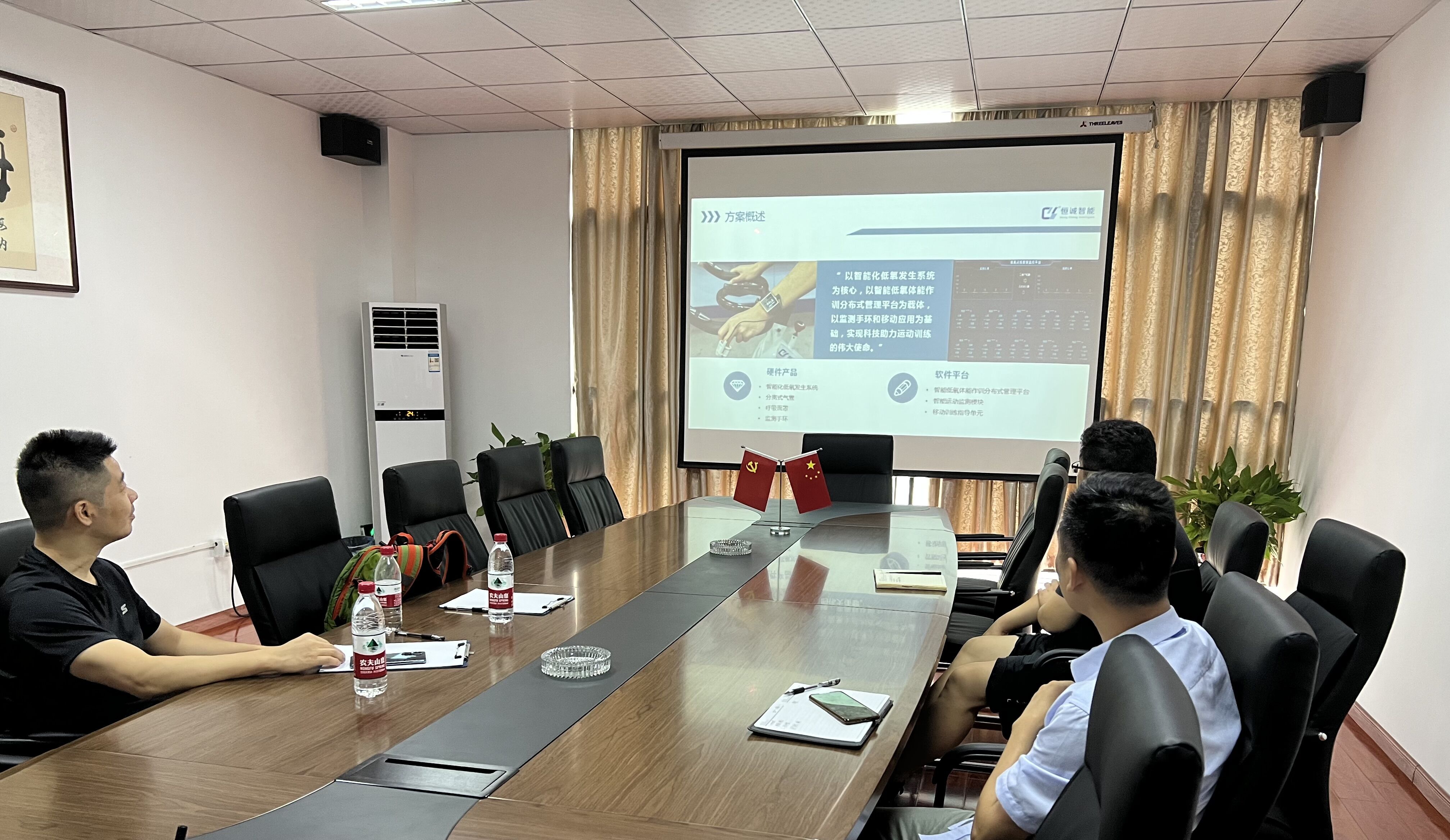 首先,芮總在我公司會(huì)議室認(rèn)真聽取了我公司張總對(duì)公司沿革及產(chǎn)品的幾大應(yīng)用領(lǐng)域的大致情況介紹。然后,張總著重介紹了我公司智能低氧作訓(xùn)產(chǎn)品在軍方的應(yīng)用,并詳細(xì)匯報(bào)了公司產(chǎn)品在其他民用產(chǎn)品領(lǐng)域(競(jìng)技體育、大眾健身、高原預(yù)適應(yīng)、醫(yī)療康養(yǎng)等領(lǐng)域)的技術(shù)儲(chǔ)備情況;以及民用產(chǎn)品未來的推廣使用前景。同時(shí),張總對(duì)公司的近兩個(gè)年度的相關(guān)業(yè)績(jī)做了匯報(bào)說明,對(duì)民用產(chǎn)品未來的市場(chǎng)化運(yùn)營(yíng)方向、市場(chǎng)潛力做了匯報(bào)。